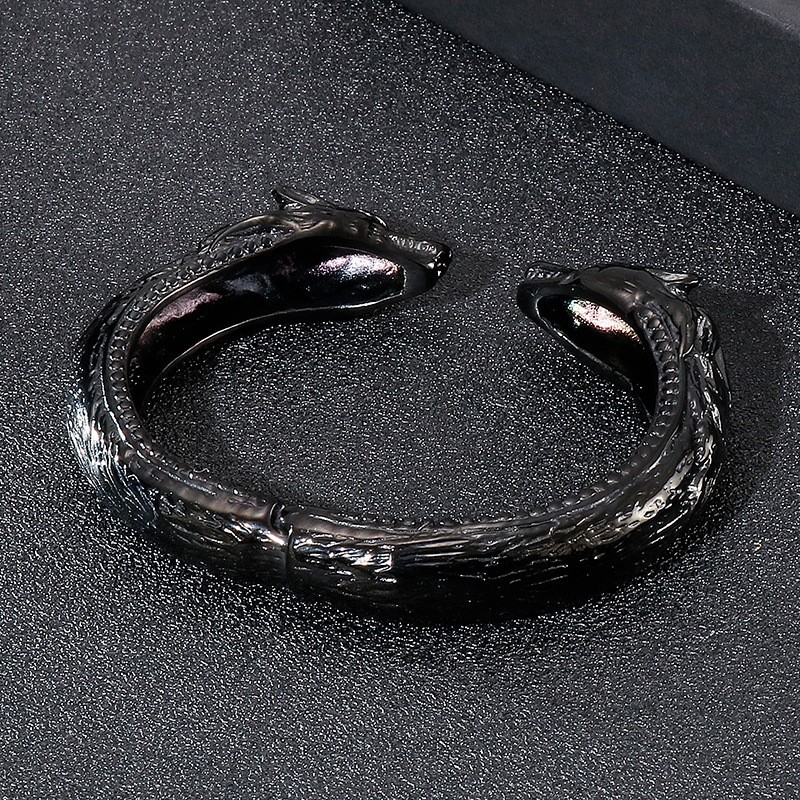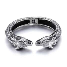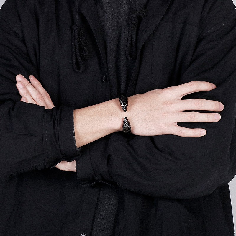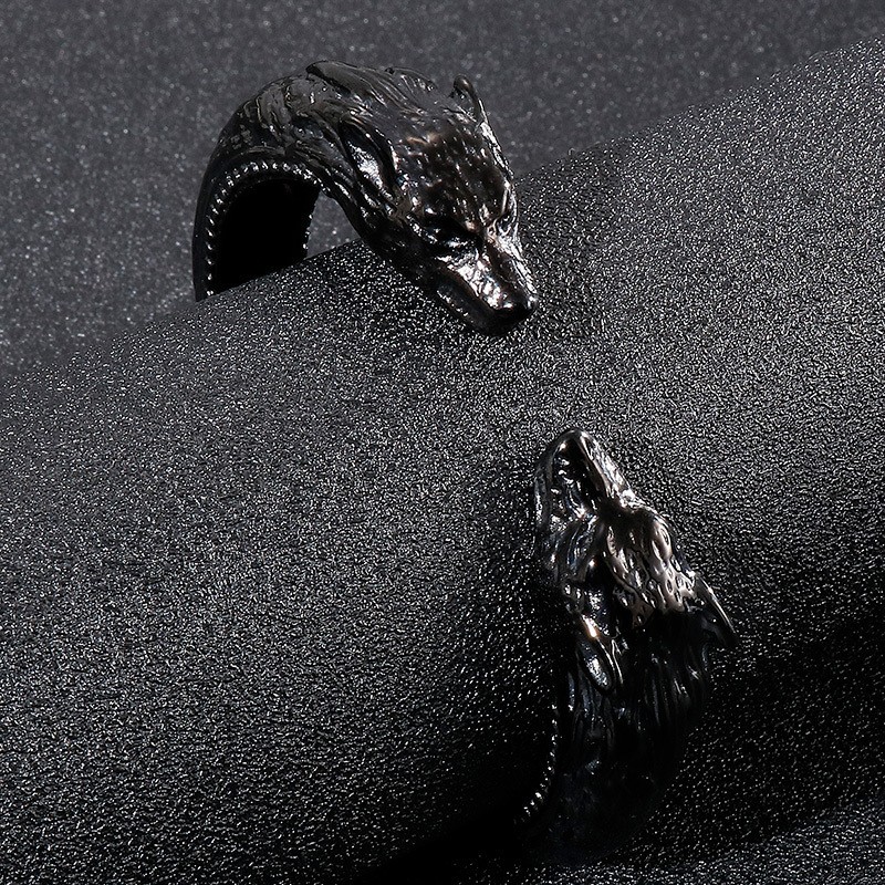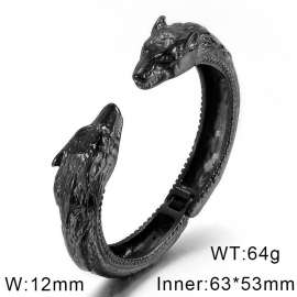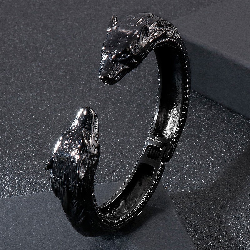 Stainless steel black cast punk style wolf head spring opening adjustable men's bracelet Bangle