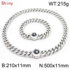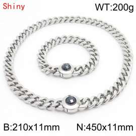 Personalized and trendy titanium steel polished Cuban chain silver bracelet necklace set, paired with black crystal snap closure