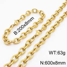 8mm gold embossed steel color men's Korean stainless steel bracelet necklace set